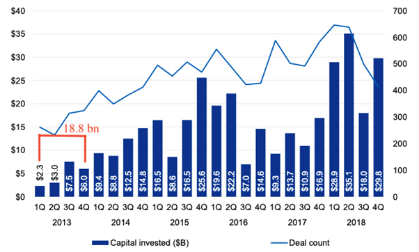 Graph 1. Total investment activity (VC, PE and M&A) in fintech 2013-2018, Source: Pulse of Fintech 2018, Global Analysis of Investment in Fintech, KPMG International (data provided by PitchBook) January 4, 2019.