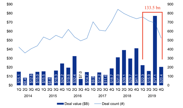 Graph 2. Total investment activity (VC, PE and M&A) in fintech 2014-Q4 2019. Source: Pulse of Fintech 2019, Global Analysis of Investment in Fintech, KPMG International (data provided by PitchBook), as of 31 December, 2019.